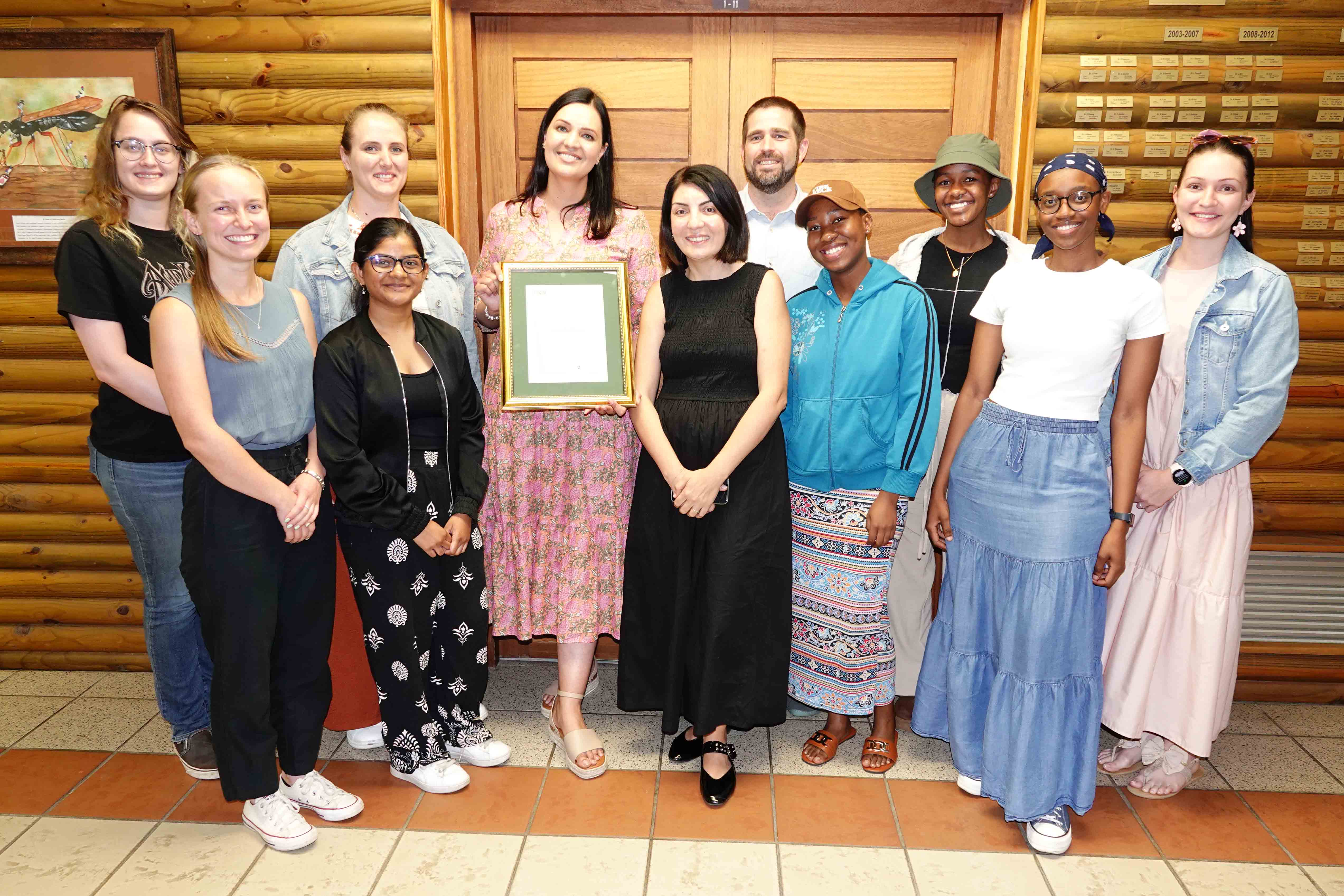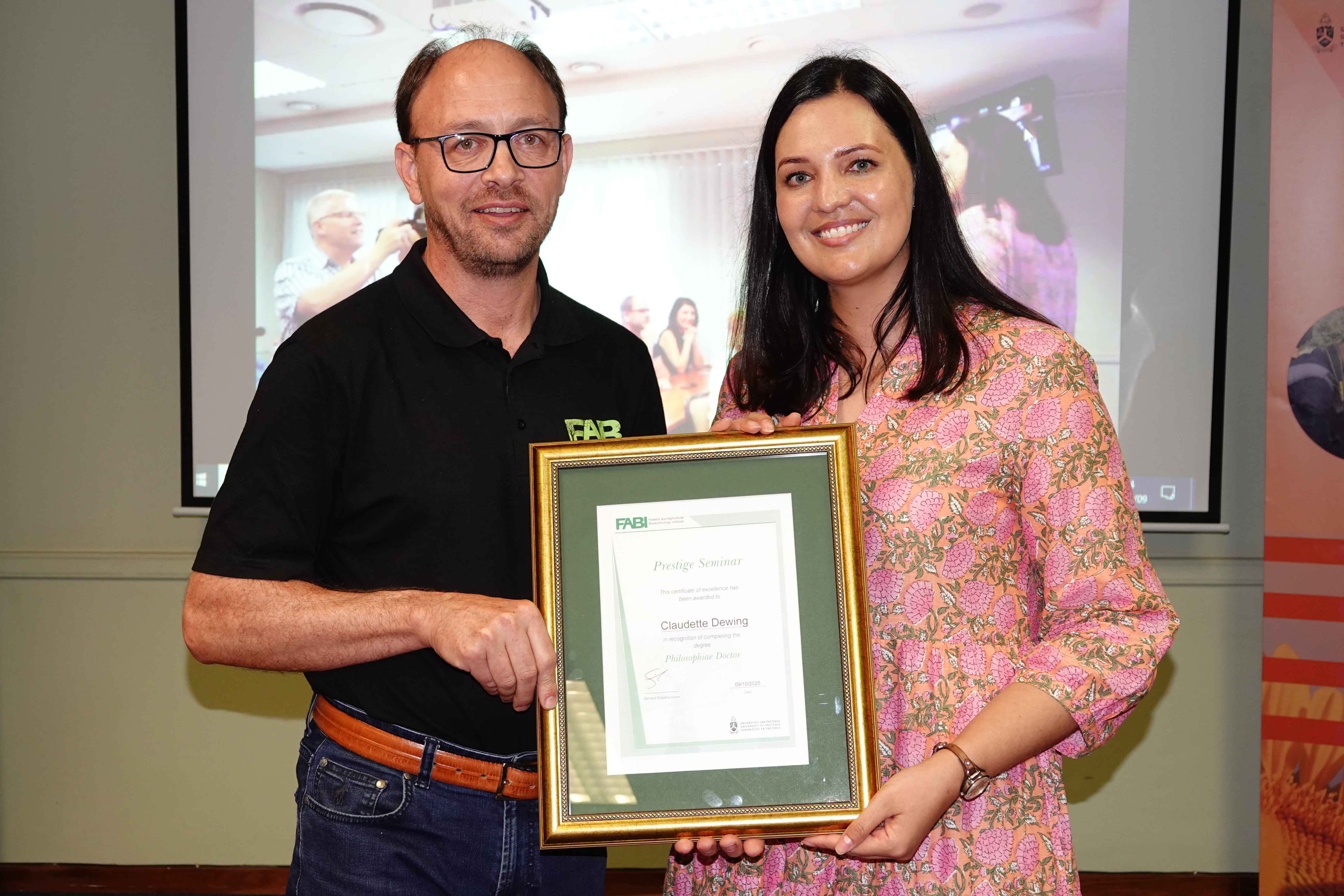 FABI recently celebrated the successful completion of Claudette Dewing’s PhD. Claudette presented her Prestige Seminar on 9 October. Her PhD project “Uncovering fungal diversity in South African dairy pastures and its implications for animal health” was supervised by Prof. Cobus Visagie, Dr Neriman Yilmaz, Prof. Emma Steenkamp and Prof. Brenda Wingfield. The external examiners for her thesis were Dr Belinda Janse van Rensburg (ARC-Grain Crops, Potchefstroom) and Dr Bevan Weir (Bioeconomy Science Institute, Manaaki Whenua – Landcare Research, New Zealand), and Prof. Martin Coetzee was the internal examiner.
