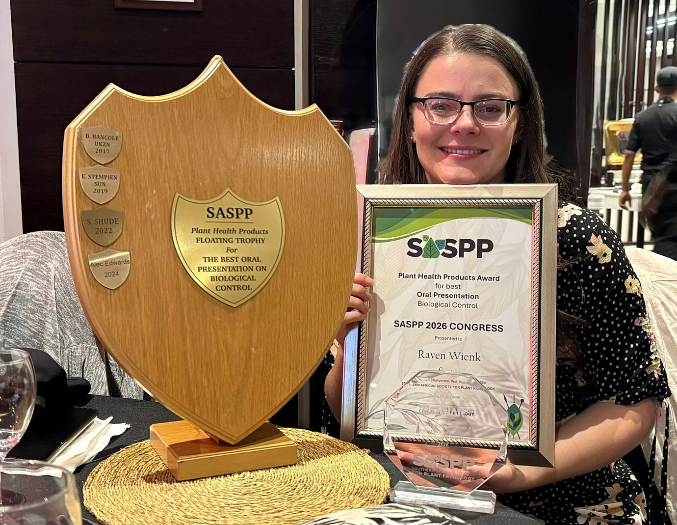 FABI participants received numerous awards presented at the Congress Dinner, including the J.E.Vanderplank Award to Dr Wilma Nel, the PANNAR floating trophy for the best oral presentation to MSc student Nhlonipho Ngubane, the PANNAR award for Best Poster Presentation by a Student to PhD student Alishia van Heerden, and the SASPP Plant Health Products Floating Trophy for Best Oral Presentation on Biological Control to PhD student Raven Wink.