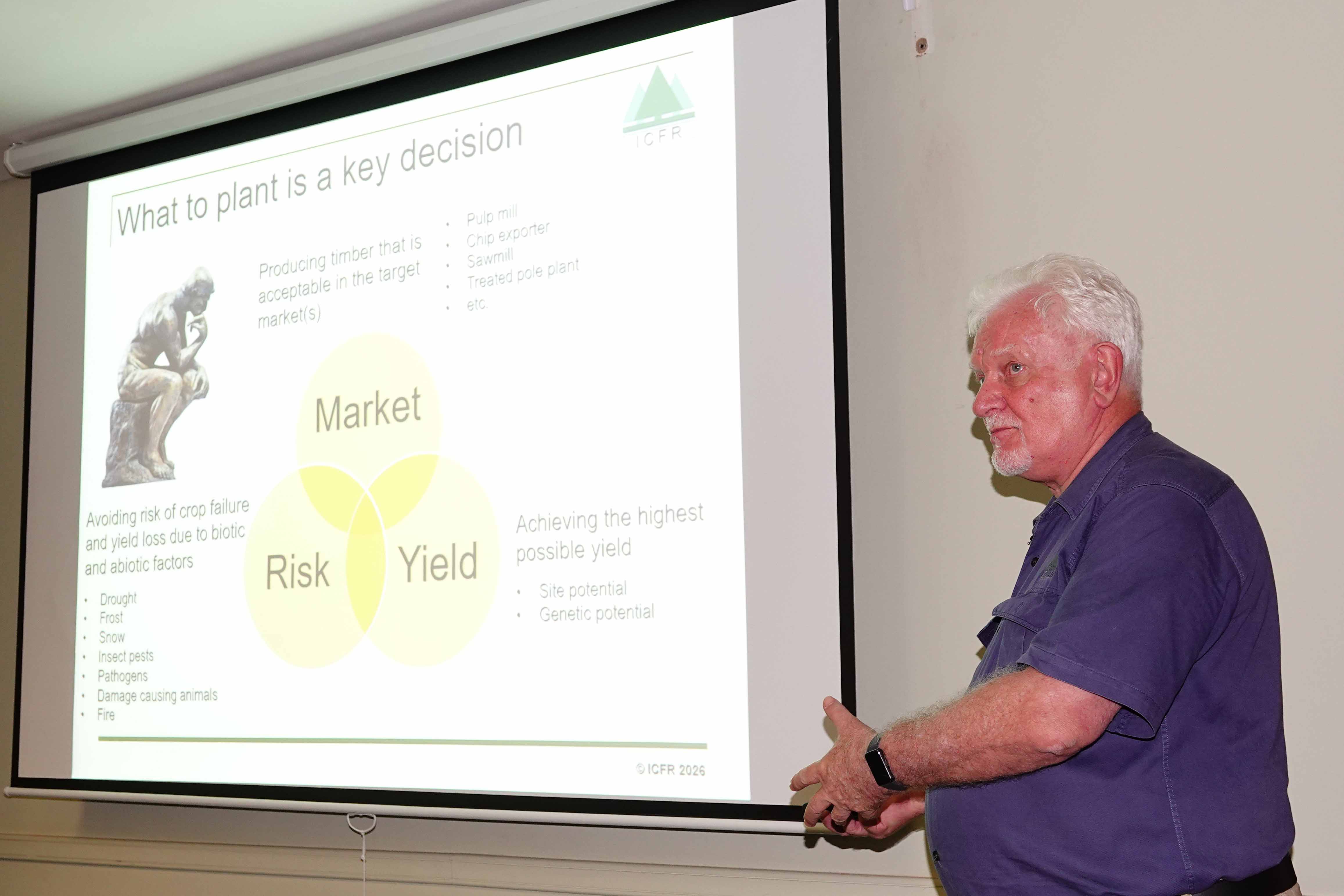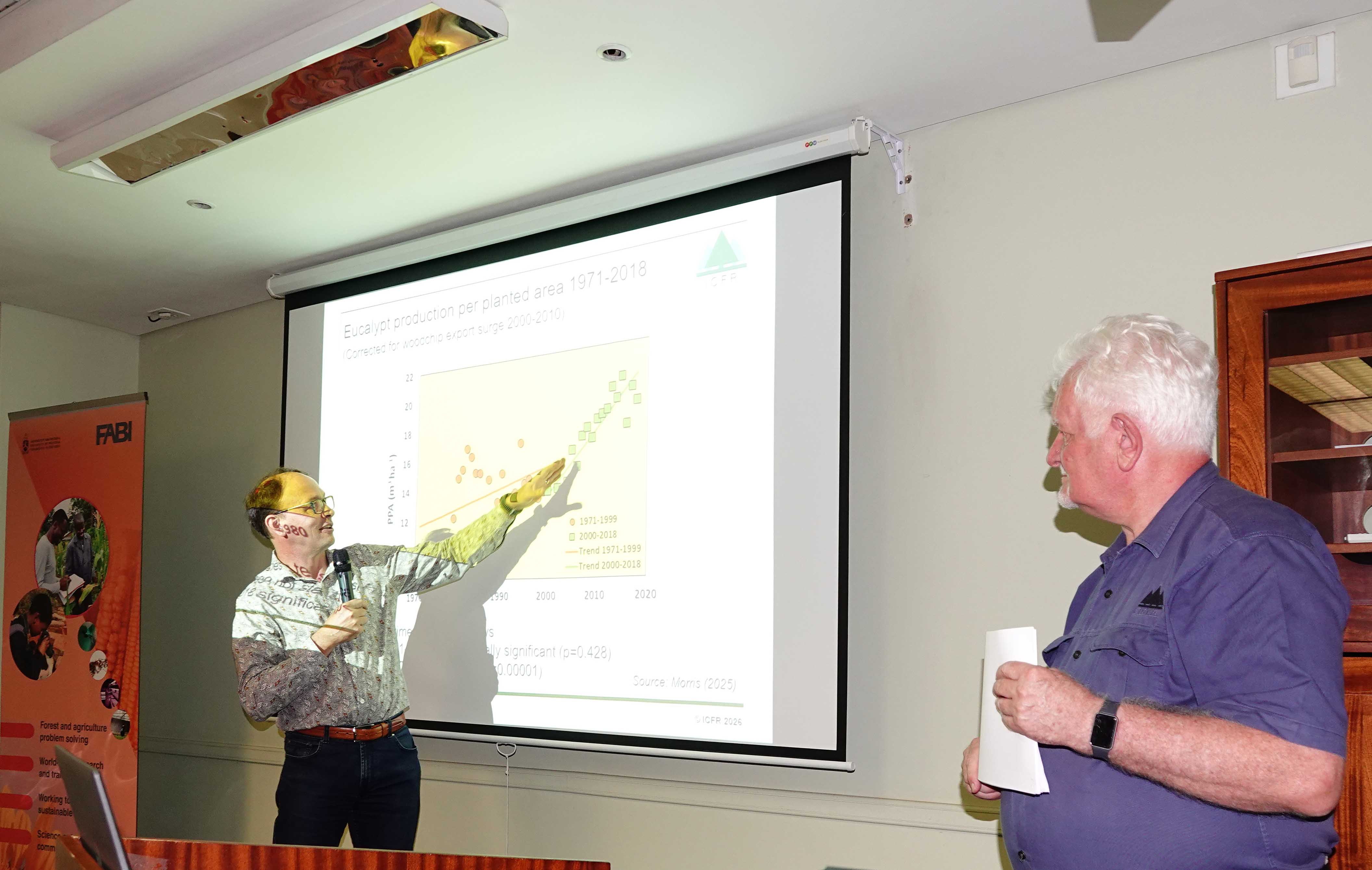 On 10 February, 60 FABI postgraduate students and researchers attended a one-day ‘introduction to forestry’ presented by a leader in the South African forestry industry, Dr Andrew Morris. Dr Morris started his forestry career in Eswatini before taking up the position of Research Manager at Sappi in 1997. During that time, Dr Morris was closely involved in the activities of the Tree Protection Co-operative Programme (TPCP) based at FABI, and for a period, also represented Sappi on the Board of the TPCP. He also led a major programme funded by Forestry South Africa to better understand the impact of the pine pitch canker disease in South Africa and in which numerous FABI researchers were involved.