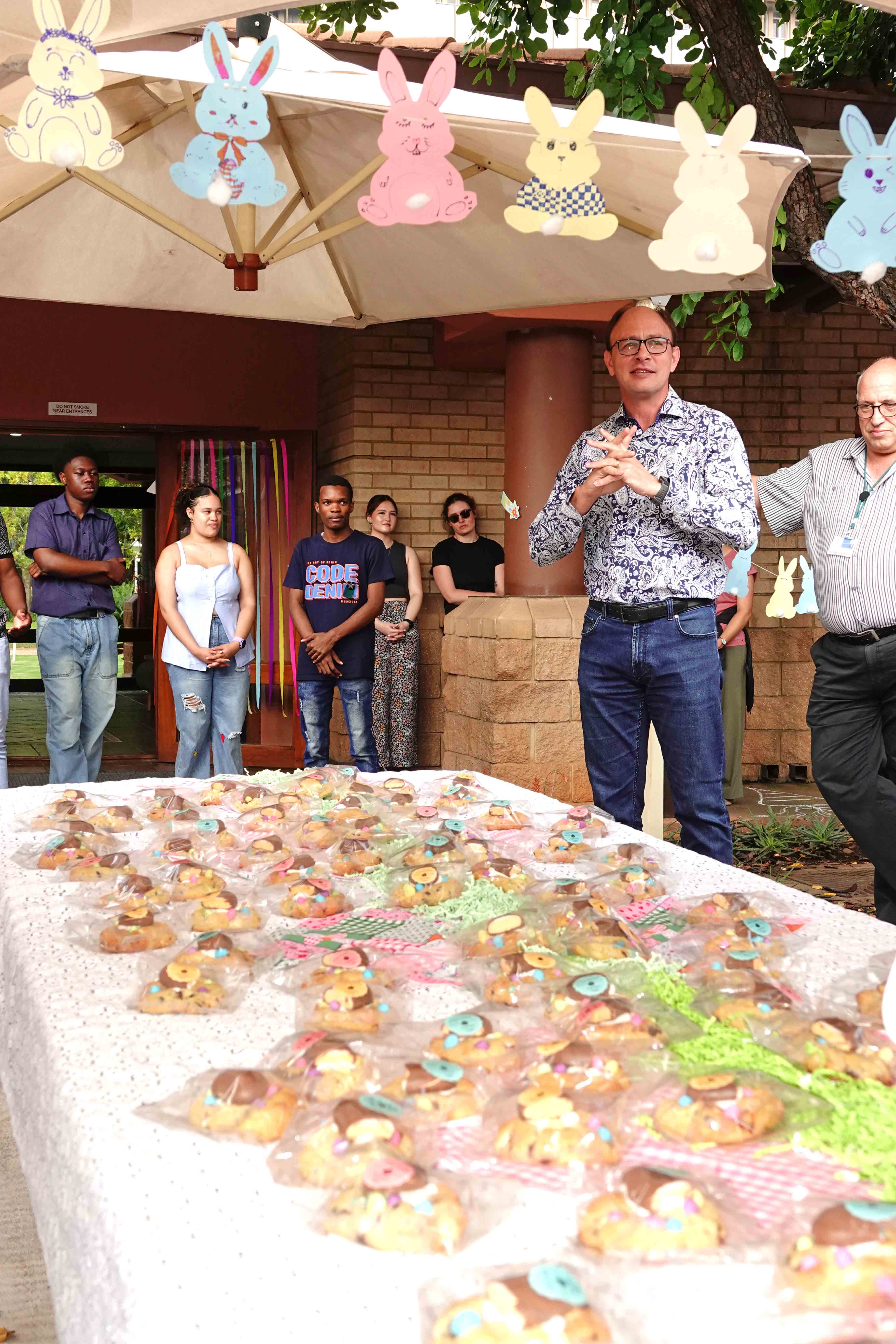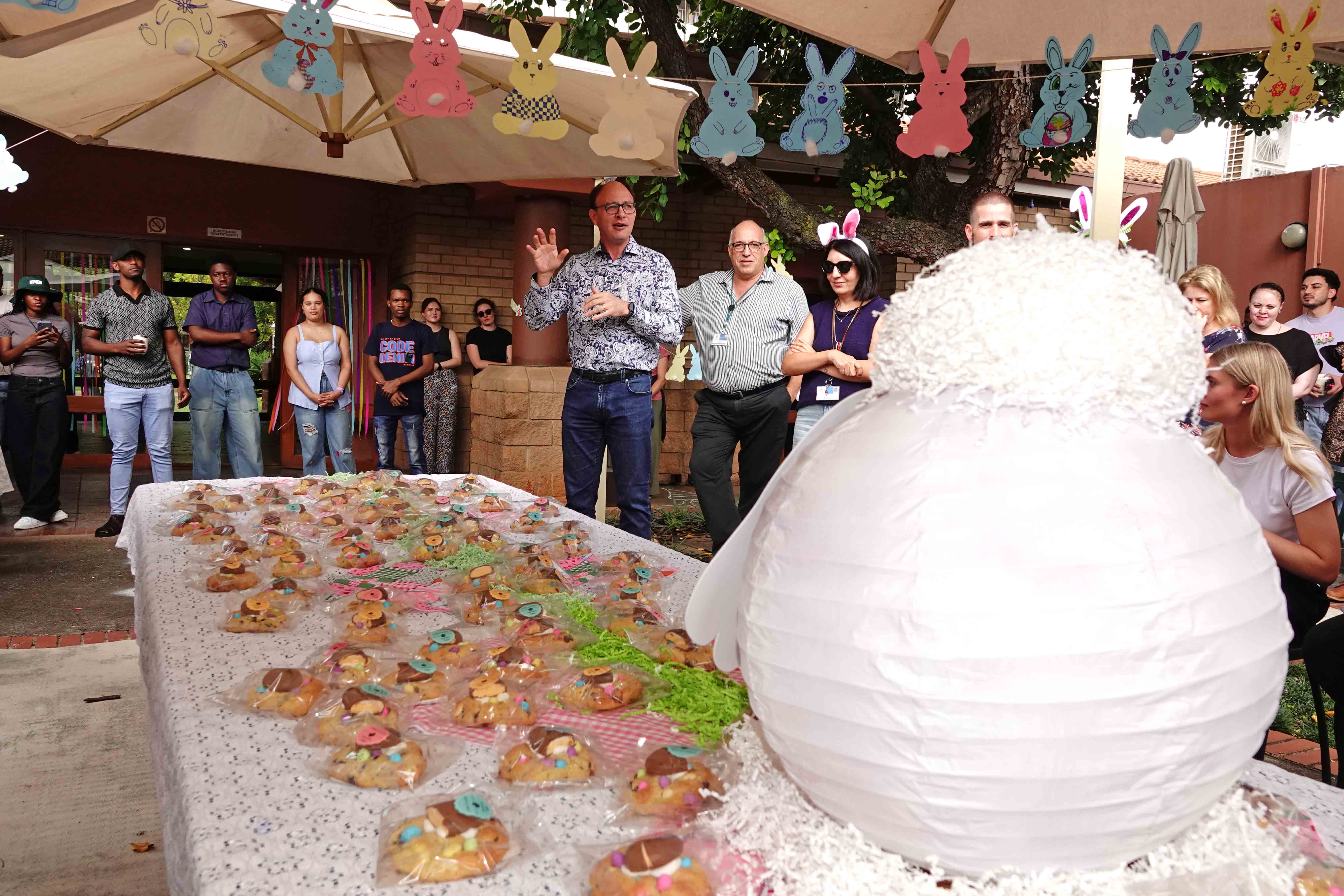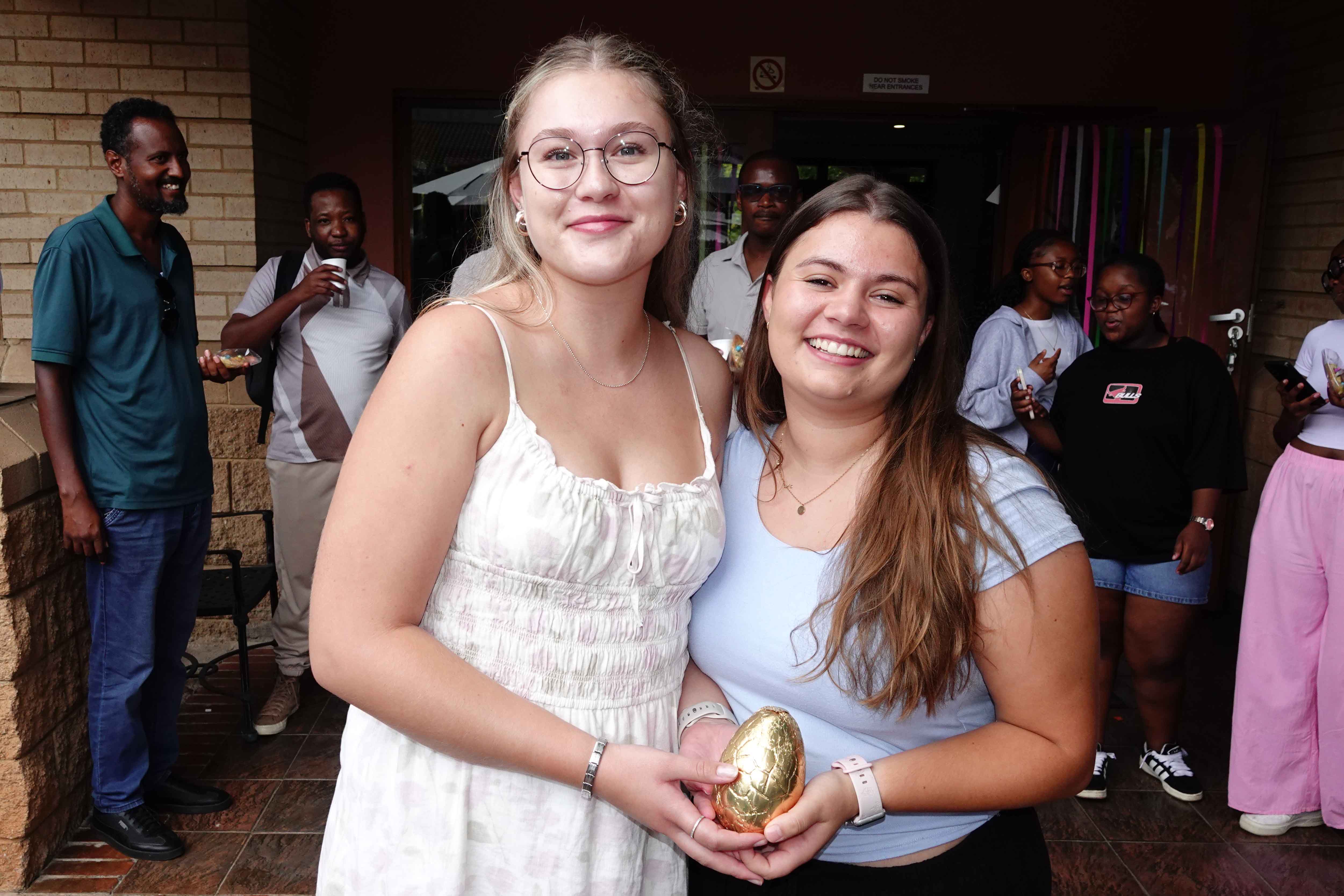 The FABI Easter Tea is one of the traditional events of the annual FABI social calendar and this year the social club team, under the enthusiastic leadership of Melandré van Lill, made sure the event was a resounding success on the morning of 26 March. The FABI courtyard was decorated with an easter bunny theme, and everyone was given a small but delicious easter-themed cookie to enjoy and just take some time off to enjoy each other’s company. During the preceding weeks the social club had left clues to the location of the Golden Egg with a prize being awarded to the first FABIan to find it. A team effort by Honours students Tayla Bolleurs en Wilmarie Cronje saw them win the prize.