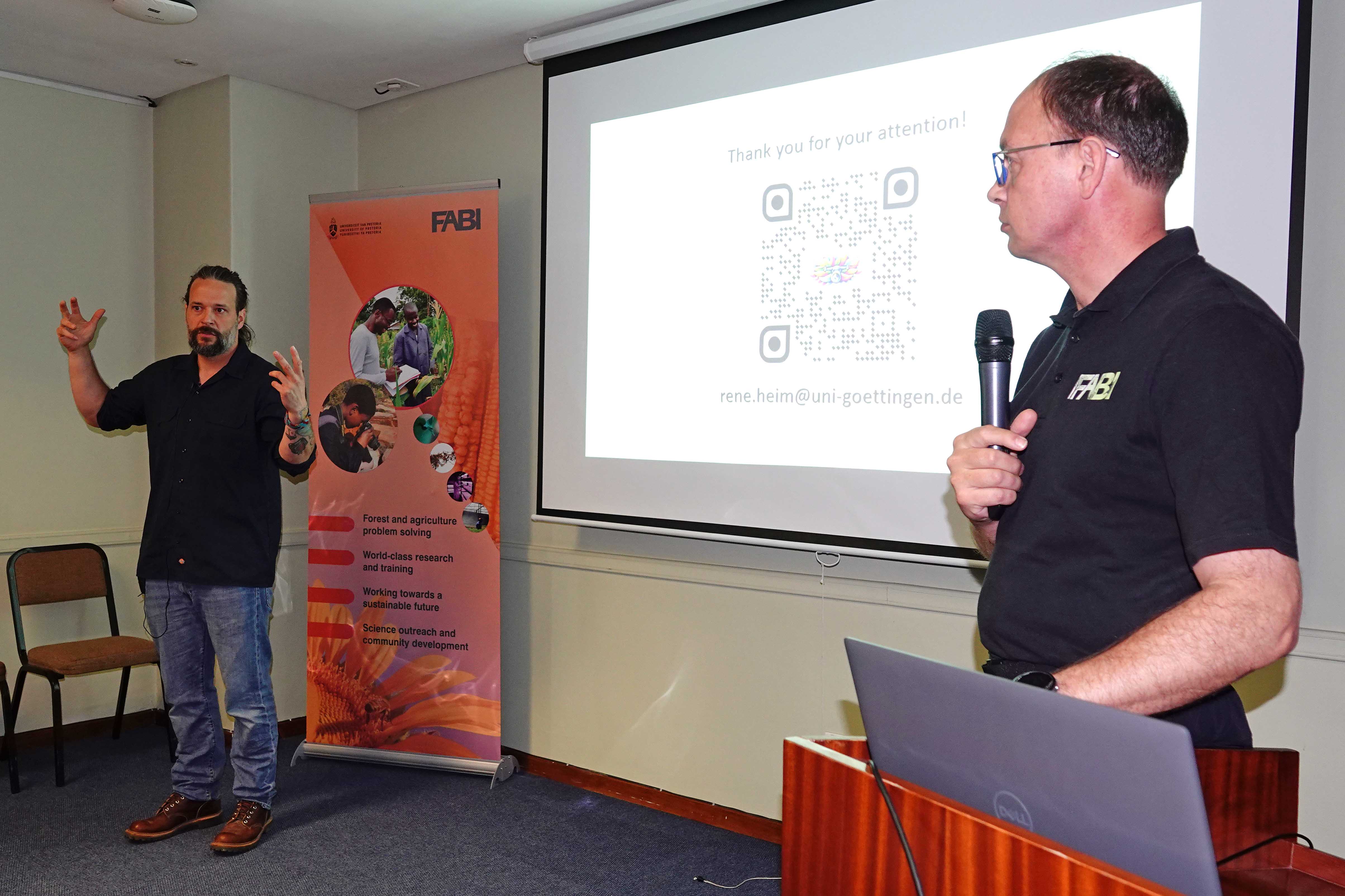 Professor René Heim of the Georg-August University of Göttingen, Germany presented a special seminar “From leaf to landscape: Interdisciplinary remote sensing of plant pathogens” in FABI on 20 April. Prof. Heim is a plant ecologist and remote sensing scientist, working at the interface of ecology, agriculture and plant pathology. He studies plant-pathogen-environment interactions and how to best integrate remote sensing data into such studies. He is a research collaborator through the Satellite Lab in Remote Sensing of Plant Health and was visiting FABI as part of this collaborative research effort. His presentation covered research projects being done in his lab and shed light on new and emerging tools and techniques for remote sensing and how to better analyse datasets.