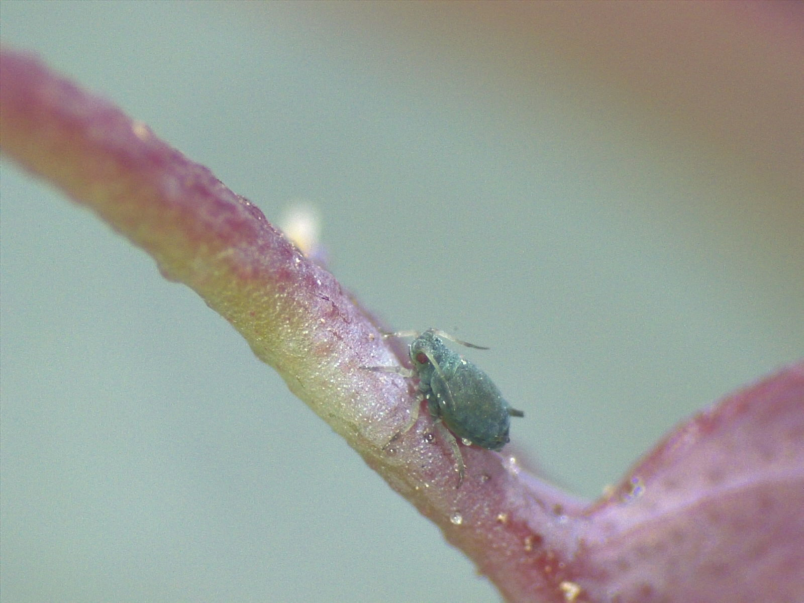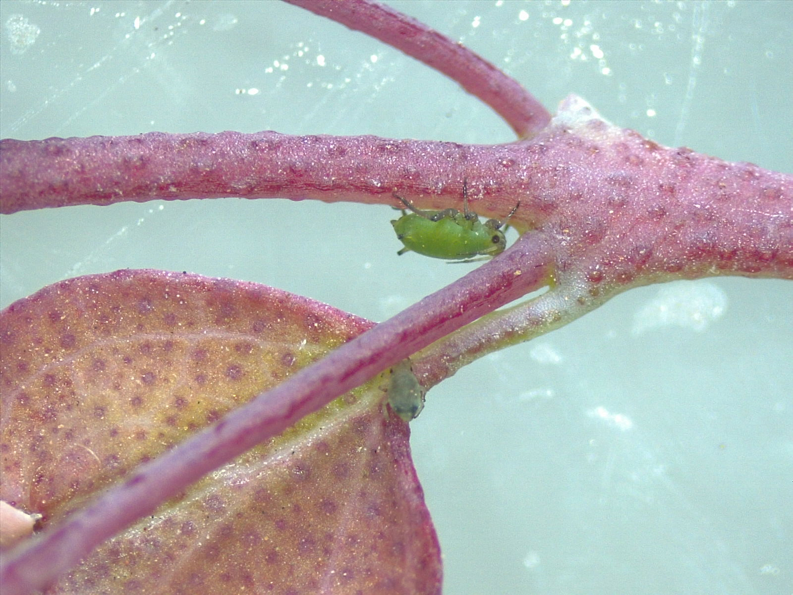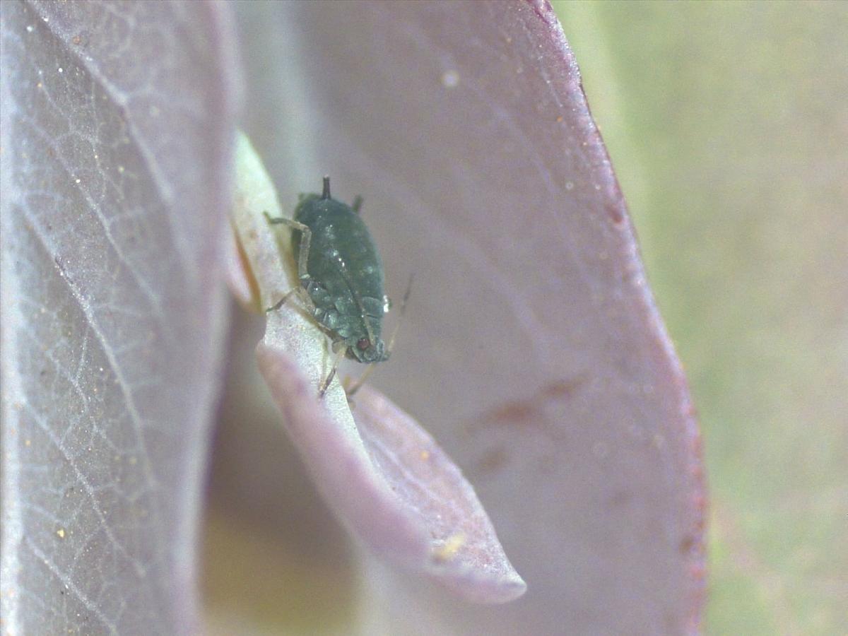 Aphis gossypii possesses a broad host range, encompassing up to 900 plant species across more than 100 families, enabling its global distribution across tropical, subtropical, and temperate regions. Its life cycle varies with climate, exhibiting anholocyclic reproduction through asexual females in warmer regions, and holocyclic reproduction involving both sexual and asexual phases in cooler climates, either on one host (autoecious) or two hosts (heteroecious). Winged adults, including both males and females, disperse primarily during daylight hours, with flight being most active from sunrise to early afternoon, and no flight occurring after dark. Egg laying occurs in protected plant sites and appears to be more driven by safeguarding of offspring eggs than the plant part.